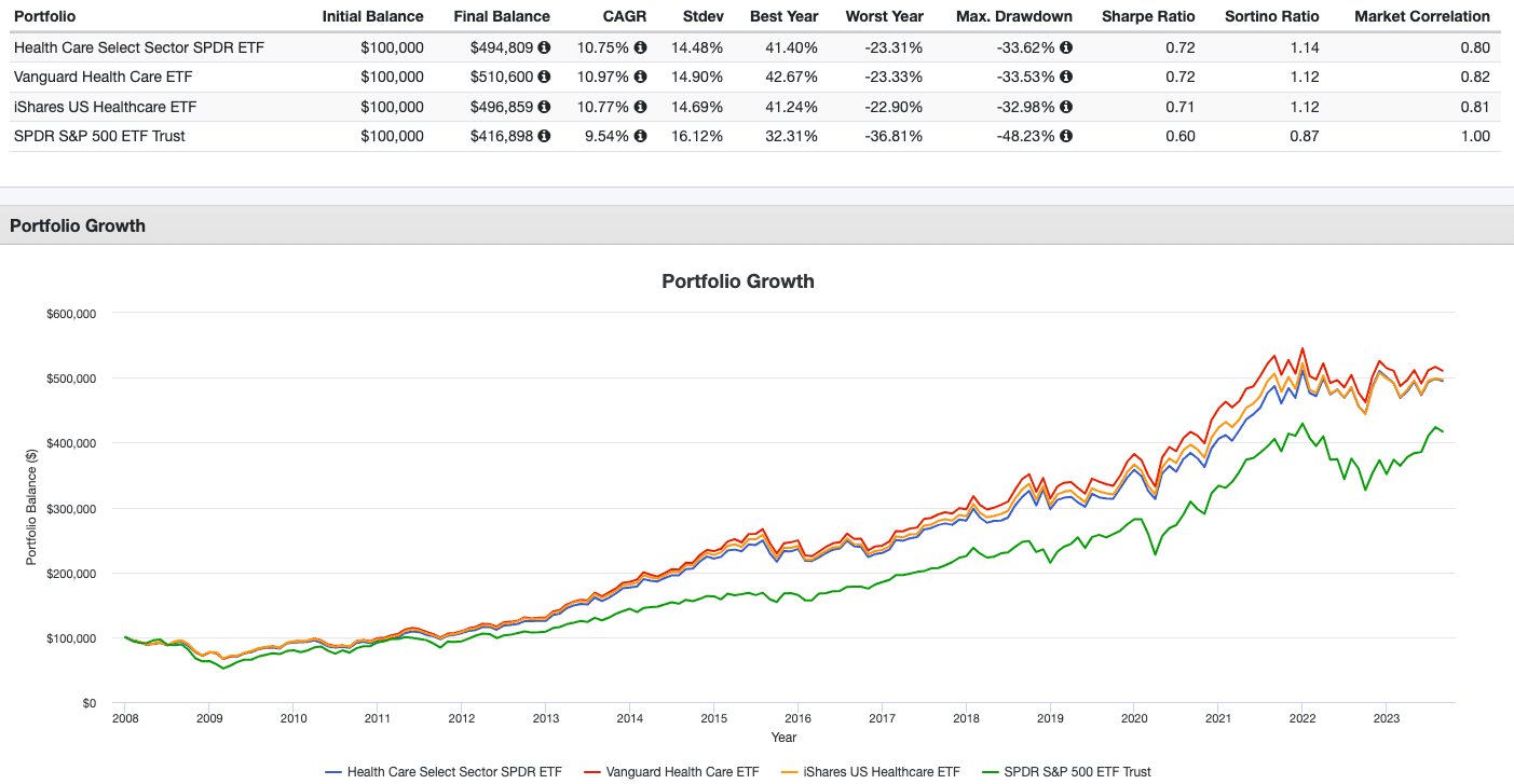 ETFs such as the Health Care Select Sector SPDR Fund (XLV), Vanguard Health Care ETF (VHT), and the iShares U.S. Healthcare ETF (IYH) provide well-diversified portfolios of healthcare stocks. The Healthcare sectors outperformed the S&P 500 index with an annual return (CAGR) of 10.97% with much less volatility at a 14.9% standard deviation. An initial investment of $100,000 in the Healthcare sector in 2008 has grown to $510,600 as of today.